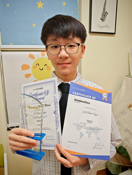 4E Lo Chun Ngai won the Champion in the clarinet world competition organized by the Music@ e-Contest Organization.